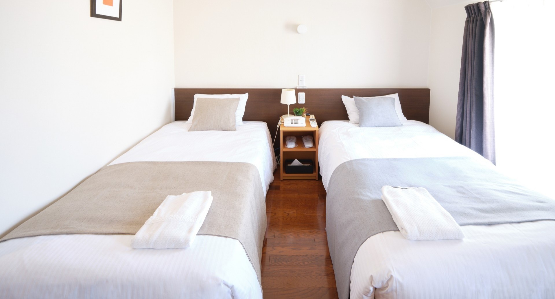 シングルサイズベッドとセミダブルサイズベッドを一台づつ備えつけた、カップルやお子様づれのお客様にも最適なお部屋です。ゆったりとしたお部屋で、存分におくつろぎくださいませ。